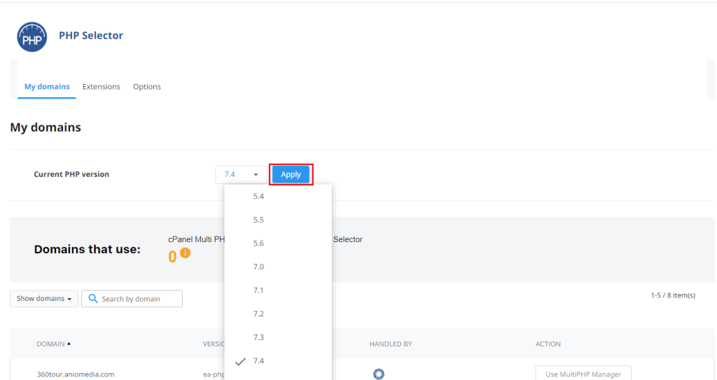 2. Để thiết đặt phiên bản PHP riêng biệt, quý khách cần tích chọn tên miền và tại phần PHP Version quý khách có thể chọn phiên bản PHP mà mình cần, sau đó nhấn Apply để thực hiện.